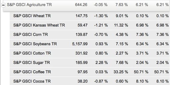 El índice Standard Poor’s GSCI Agriculture de ocho materias primas, presenta unos valores positivos en todas ellas.